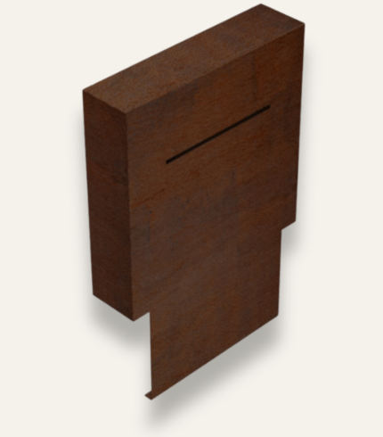 Rectangular shape with a unique stepped base develops a natural rust patina over time. A narrow slit at the top allows water to flow smoothly down the front, creating a serene focal point for any modern outdoor space.