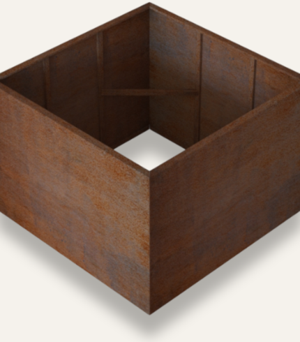 Designed to be a striking centerpiece, this planter seamlessly blends into both contemporary garden settings and urban environments, complementing a range of designs. Its sleek and rich, rust-like patina make it a timeless addition to any high-end landscape.