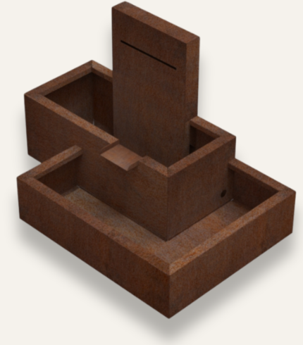The Klifbrek Fountain features a bold, geometric design with a clean, minimalist aesthetic. It is crafted from weathered steel, giving it a rich, rust-colored finish that adds an industrial charm.