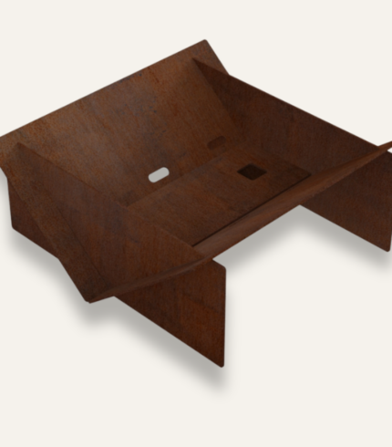 The Corten Steel Laki Fireplace features a unique, angular design with intersecting panels, creating a modern, sculptural look.