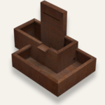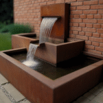 The Klifbrek Fountain features a bold, geometric design with a clean, minimalist aesthetic. It is crafted from weathered steel, giving it a rich, rust-colored finish that adds an industrial charm.