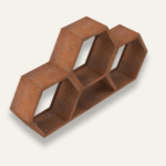 This luxurious Corten steel piece, with its sleek hexagonal shape and unique rust-like patina, serves as a striking decorative accent.